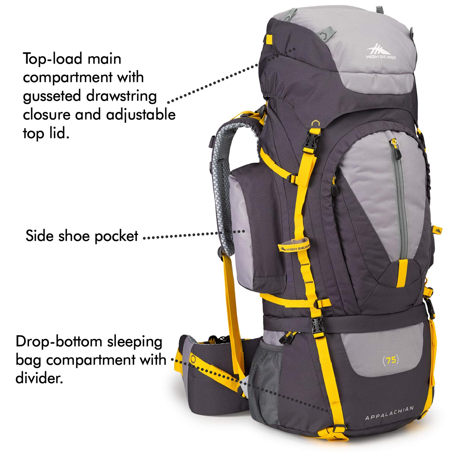 High Performance Pack for Backpacking Hiking Camping with Rain Fly. The High Sierra Appalachian 75 backpack is made from a combination of mini diamond ripstop and ballistic nylon fabric and features a durable design with a molded foam back panel a single contoured aluminum frame bar and multiple storage compartments. With a huge main compartment capable of storing 75 liters.